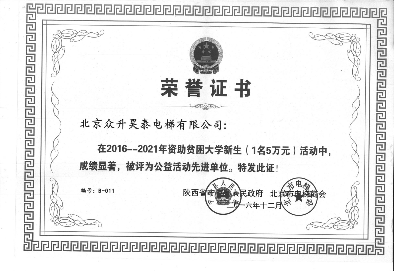 我公司积极参与电梯商会和宁陕县政府联合组织的捐资助学公益活动,资助贫困大学生,在此次活动中被评为先进单位